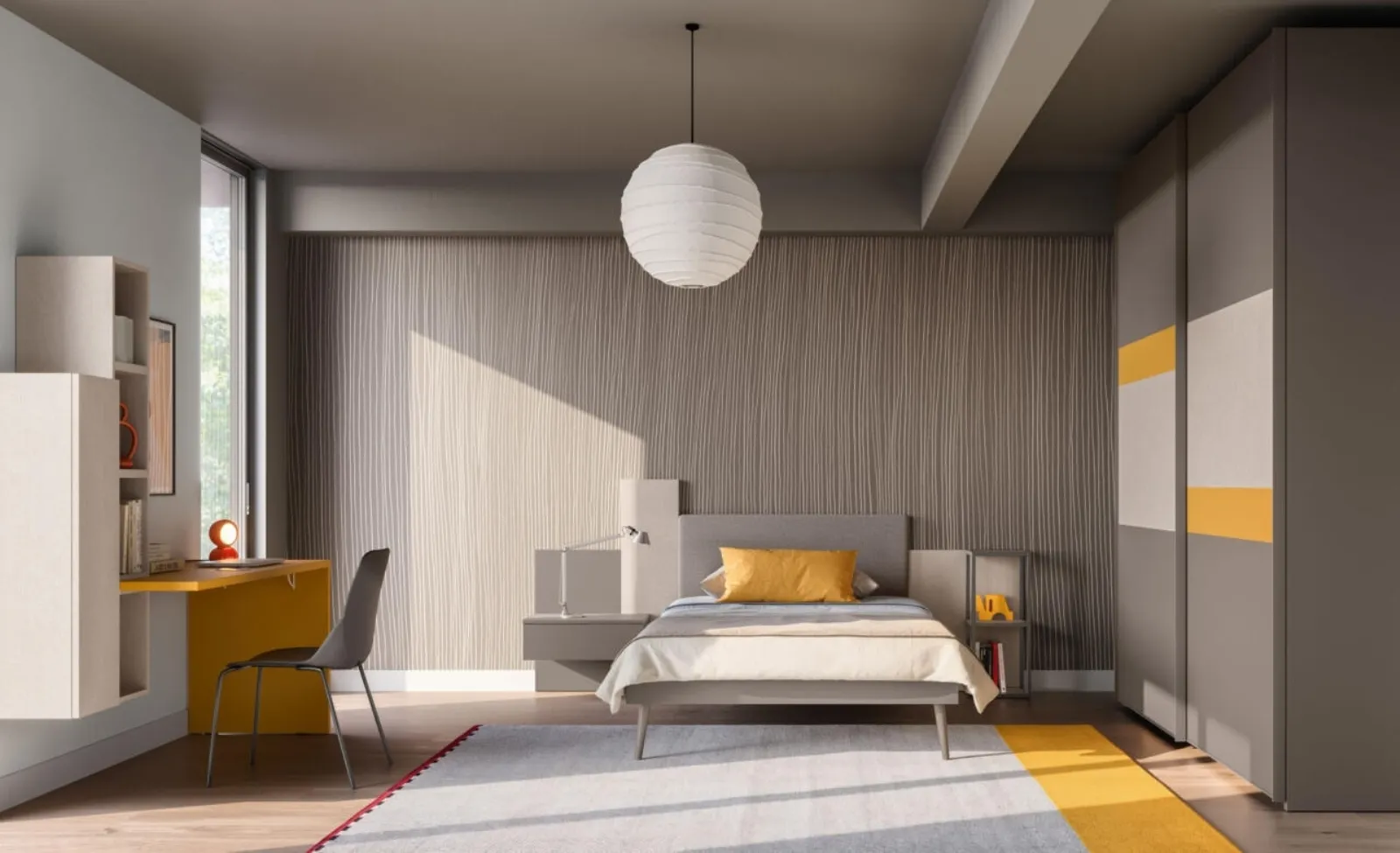 Mistral offers a wide range of accessories to customize: you will find beds, wardrobes, desks, chairs, and bookshelves. This melamine solution perfectly combines the practical and aesthetic qualities of the bedroom, as it is able to combine functionality and ergonomics. Bring aesthetic value and vibrant tones to the room dedicated to children with this solution, one of Mistral's modular bedrooms for boys. If you are looking for creative ideas to perfectly decorate your children's room, we present the ground bed bedroom 17 by Mistral with a melamine finish.