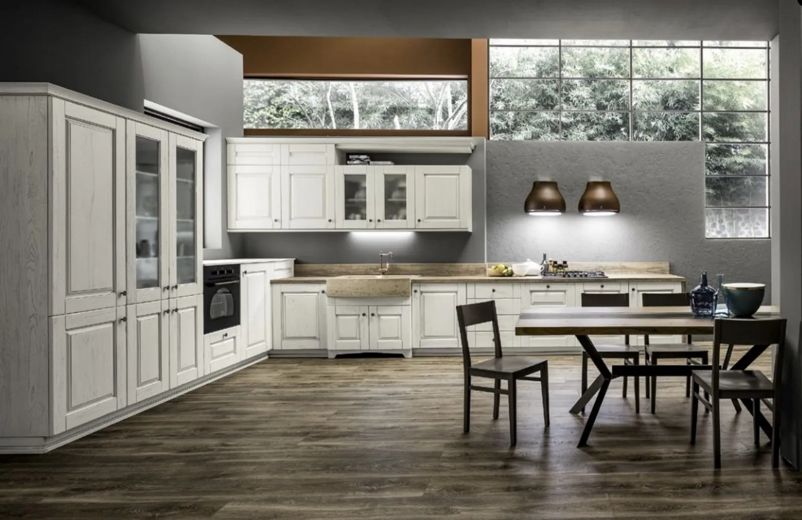 The classic corner solutions available in our store are characterized by a strong personality and a typical suggestive appearance, which in this case is personal and unique. The most exclusive Classic Corner Kitchens are waiting for you to enhance the space according to the modern evolution of furniture with an undisputed classic style over time. Discover the Nora 05 corner Classic Kitchen by Arrex in the photograph: let yourself be intrigued by the sinuous lines of this wooden model.