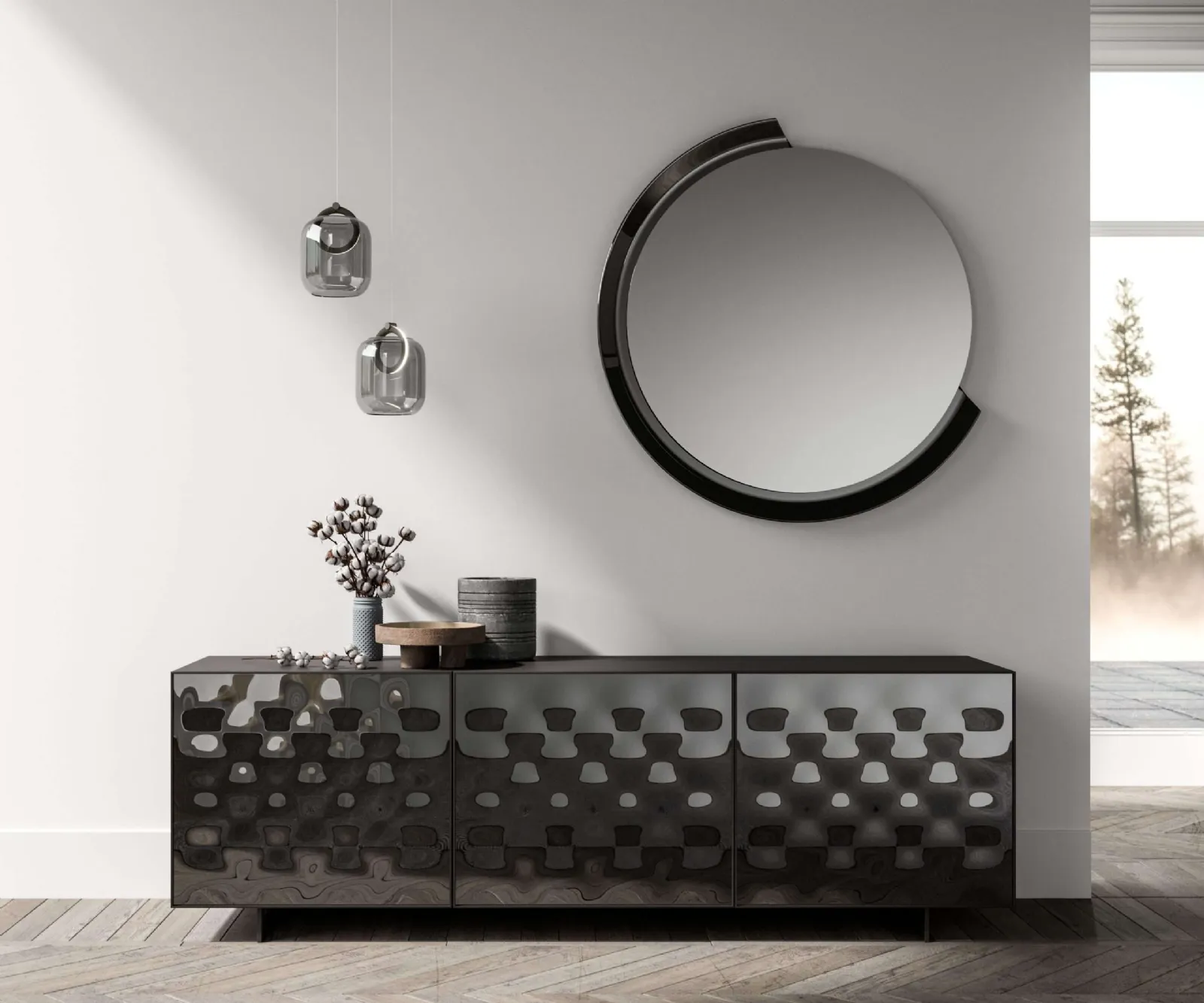 The high aesthetic value furnishing compositions of the brand Ozzio personalize the environment with color and taste, recreating particular furnishing atmospheres. Highly versatile and multifunctional, modern glass accessories serve diverse functions: they enhance the practical qualities and aesthetic value of the environment. In our store, you can experience firsthand the excellence of the brand's modern glass mirror models, just like this solution in the photo. Ozzio's Kelly mirror with glass frame will give personality and charm to a room furnished with modern-inspired furniture and accessory items. Accessories and mirrors personalize the home decor, occupying the space in a useful way and making it welcoming and beautiful to look at.