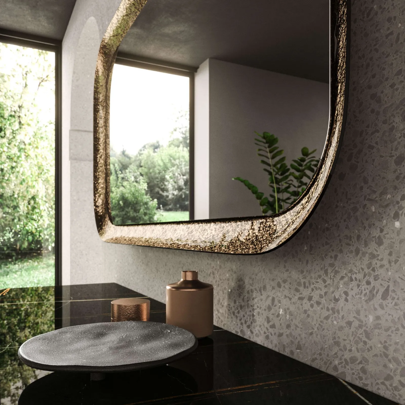 Very versatile and multifunctional, modern glass complements fulfill different functions: they enhance the practical qualities and aesthetic value of the environment. Complements and mirrors complete the home furnishings, filling the space in a useful and welcoming way, with great aesthetic value. The Raggio di Ozzio glass-framed mirror will add personality and charm to a room furnished with modern furniture and accessories. The charming design compositions by the Ozzio brand make the habitat beautiful with color and style, creating unique furnishing atmospheres. In our showroom, you can experience the quality of the modern glass mirror models from the brand firsthand, just like this solution in the photo.