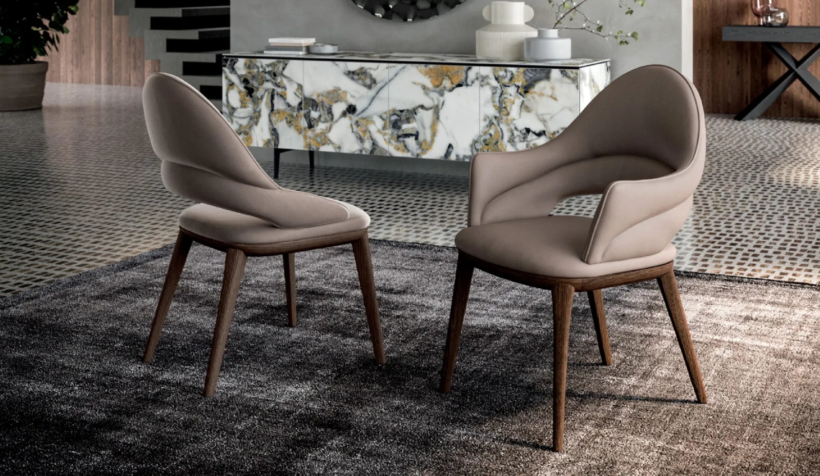 Peeking through our leather solutions will allow you to find the dining chair model you have always wanted. Ozzio Bay Chair with or without arms: choose one of the most beautiful proposals from the leading brand in Home Furnishings. A rich catalog of furniture and accessories is waiting for you in the store, where you can find fixed leather chairs from top brands. With this comfortable, ergonomic, and aesthetically pleasing solution, you can complete your furnishing project and enhance the room where you chat with family and friends. If you want to enhance designer atmospheres, the model visible in the photo is the ideal choice for a space of this style.