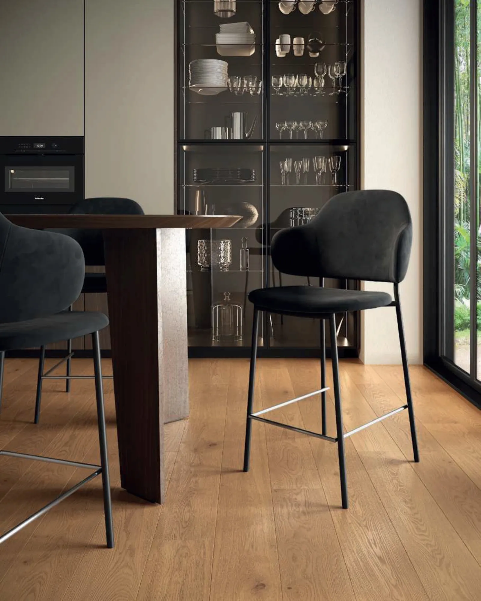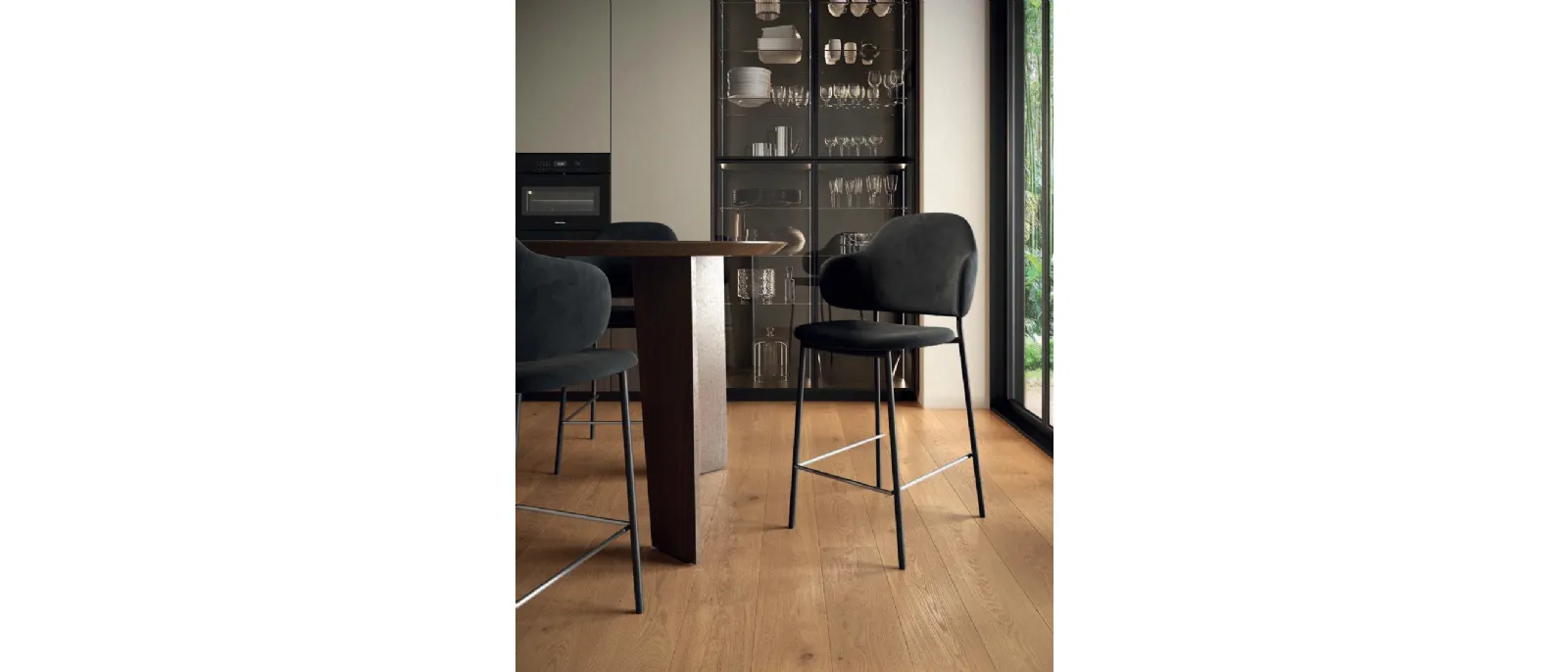 Every Di Lazzaro solution ensures a certain style regardless of the destination room, as it organizes spaces by enriching them. In our store, you can see live the most exclusive proposals on the market, including kitchen designs signed by the well-known brand Di Lazzaro. Chairs are essential furniture and complements in every home, which is why we offer a wide range of solutions in-store to choose from based on your preferences. Mia stool in velvet by Di Lazzaro in fabric: it will help organize the dining area or the living room of your home, combining practicality and design.