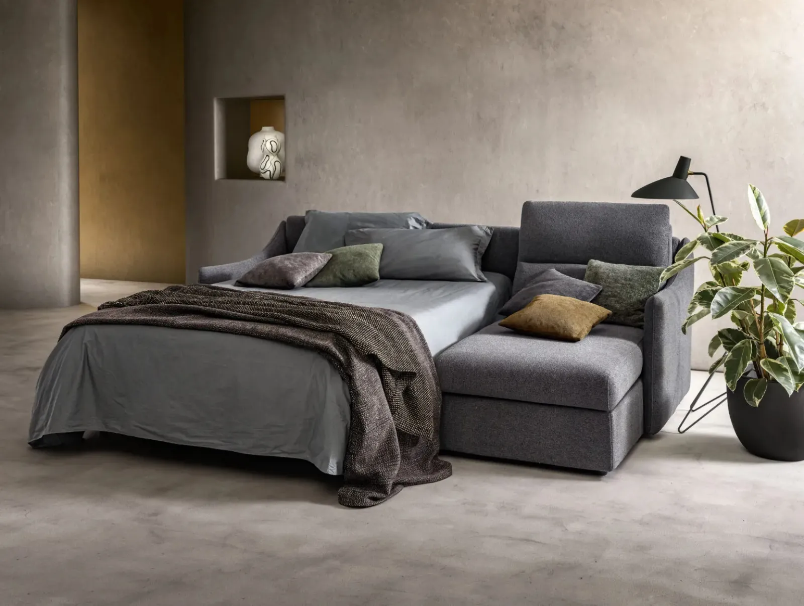 The living room is the protagonist of the daytime environment of every home, with upholstered furniture being the modules around which to spend moments of relaxation and socializing. Sofas, armchairs, and ottomans are essential elements of the living room area, to be decorated with attention. Logan Sofa Bed by Samoa: be inspired by our proposals for modern sofas and armchairs that can guarantee comfort, practicality, and design in your living room. Samoa, a leader in sofa manufacturing, has created a sophisticated and elegant fabric covering for the model pictured.