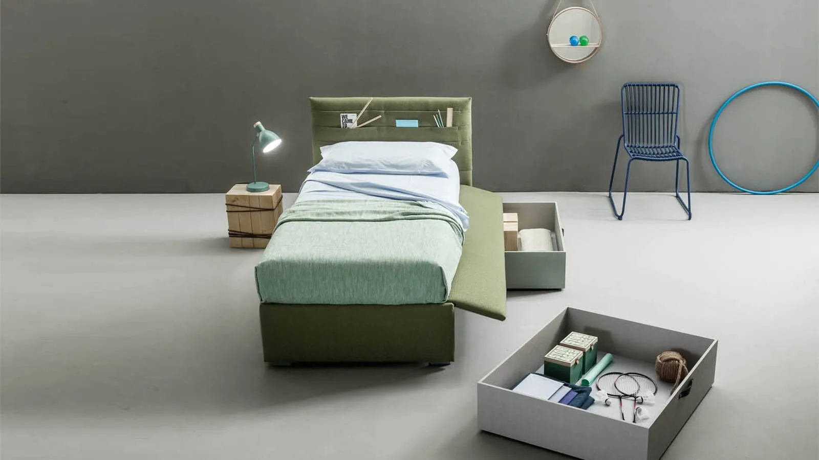 Discover more about Bside's Pocket single bed in the image: it is the solution to perfectly recreate a welcoming, beautiful, and well-organized environment, ideal for your children. Quality materials and non-toxic paints characterize the brand's offerings: if the room has limited dimensions, there are various solutions available, always able to combine functionality and ergonomics. A rich range of modern fabric beds is waiting for you: the Bside brand offers several versions of beds that always meet the children's needs.
